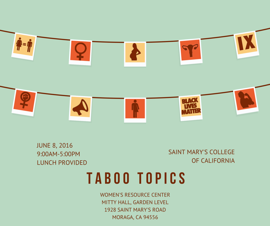 The Women's Resource Center at Saint Mary's College of California would like to invite you to join us for Taboo Topics on June 8, 2016 Please see attached for invite and rough outline of the day.